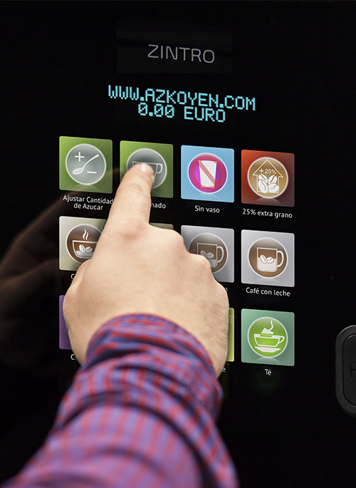 Zintro ist mit einem exklusiven, von Azkoyen patentierten Touchscreen ausgestattet. Die Frontpartie und die Etiketten lassen sich personalisieren.